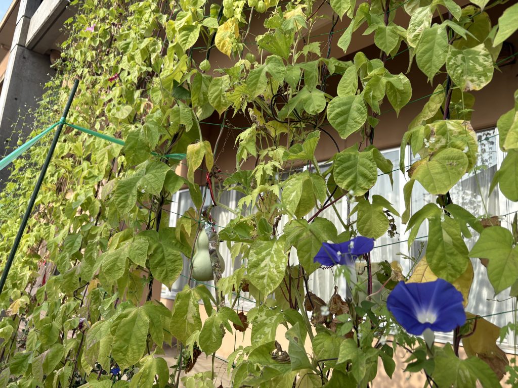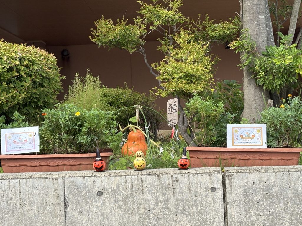 また、ハロウィンに向けてジャンボカボチャを育てています。色で塗られたひょうたんに見守られながら、カボチャはまだまだ大きくなる予定です。